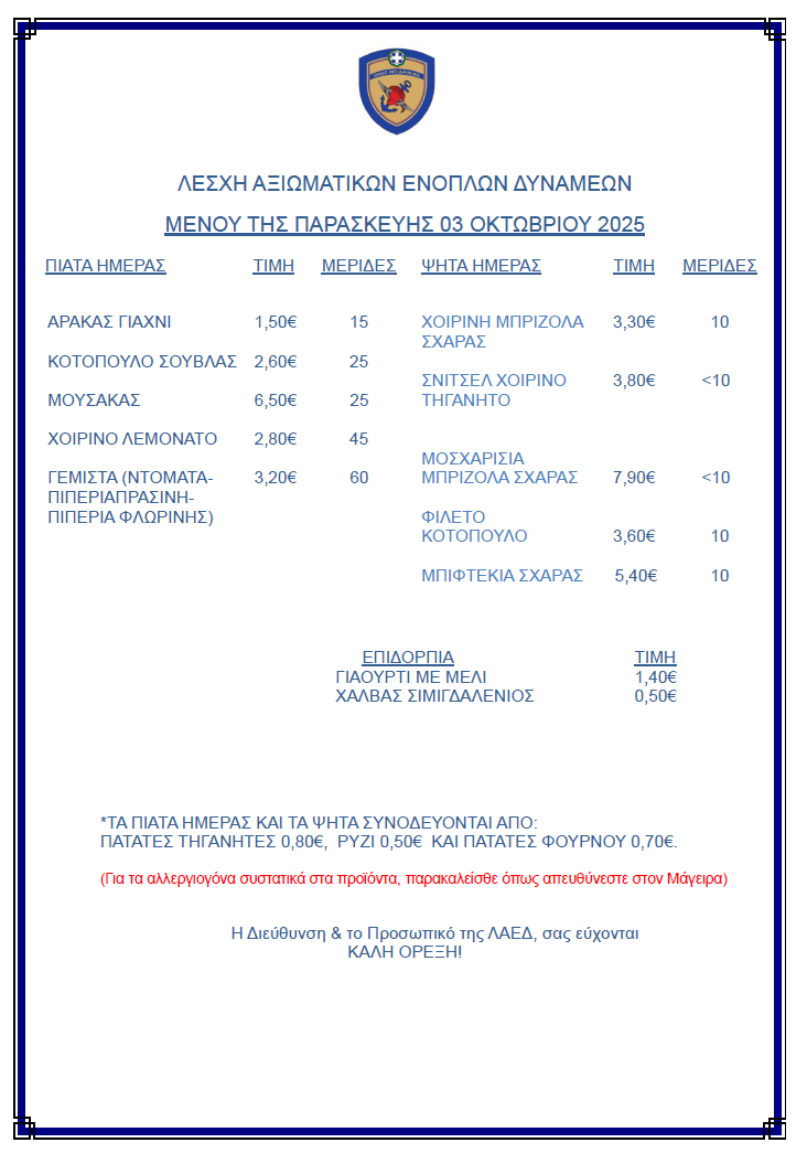 Για το Μενού Σάββατο – Κυριακής, μόνο για τους καλοκαιρινού μήνες μπορείτε να το δείτε από την Σελίδα μας στο Facebook πατώντας τον παρακάτω σύνδεσμο